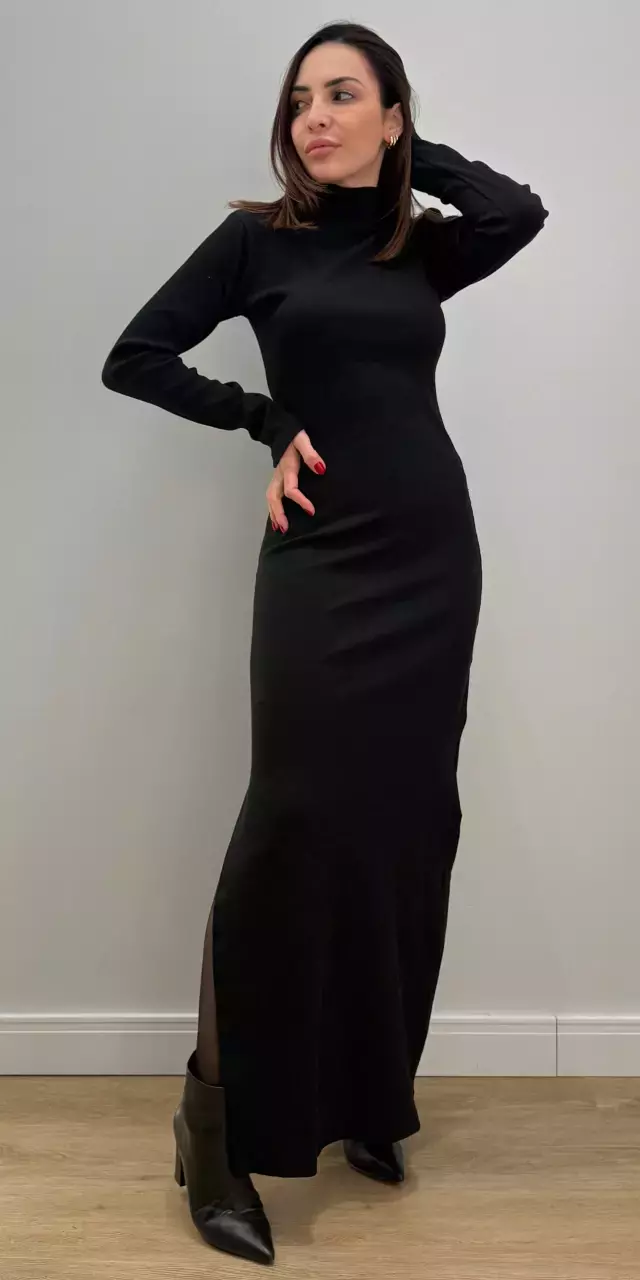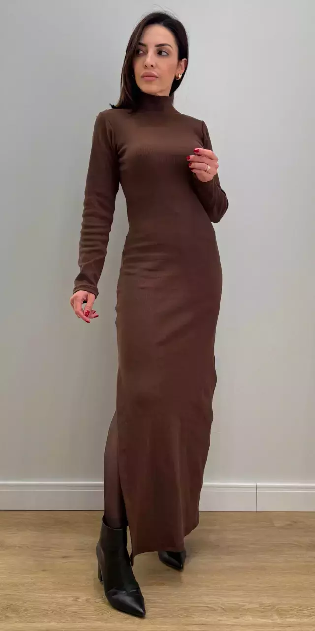 O vestido confeccionado em malha canelada de algodão, que combina conforto com elegância. Possui mangas longas que conferem um ar sofisticado e ideal para dias mais frios, além de uma gola alta que reforça o visual elegante e moderno. O tecido canelado acrescenta textura ao look, proporcionando um caimento ajustado ao corpo, valorizando a silhueta de forma sutil. A fenda lateral acrescenta um toque sensual e leveza ao movimento, equilibrando a formalidade da gola alta com um detalhe mais ousado. Esse vestido é versátil, podendo ser usado tanto em produções casuais quanto em ocasiões mais refinadas, dependendo dos acessórios escolhidos.